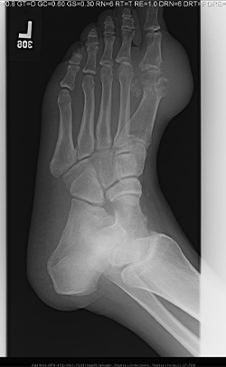 - Se solicitó una radiografía oblicua del pie izquierdo con datos de erosión severa de la cabeza del primer metatarsiano, saliente del margen óseo, tofo suprayacente, ausencia de estrechamiento significativo del espacio articular.
