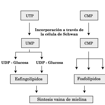 UTP actúa como coenzima en la síntesis de los glucolípidos de las estructuras neuronales y la vaina de mielina, completando la acción del CMP.